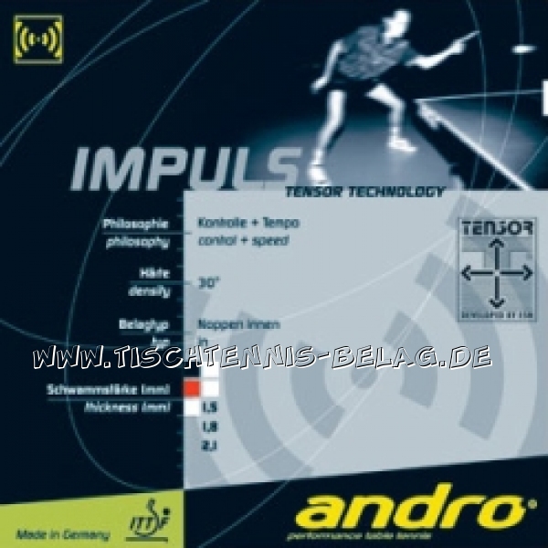 IMPULS ist in einem modifizierten TENSOR Verfahren hergestellt, dabei aber weicher und elastischer als konventionell gefertigte Beläge. Er absorbiert Energie beim passiven Spiel und setzt beim aktiven Spiel Energie frei. Allround-Spieler können daher diesen schnellen Belag mühelos kontrollieren, bei Schupf, Block oder Schnitt schluckt der 30° weiche TENSOR-Schwamm jede Geschwindigkeitsspitze. Beim Angriffsspiel mit Spin oder Schuss entwickelt der „Allround“ TENSOR mächtig Kraft, die Bälle kommen schneller und präziser.